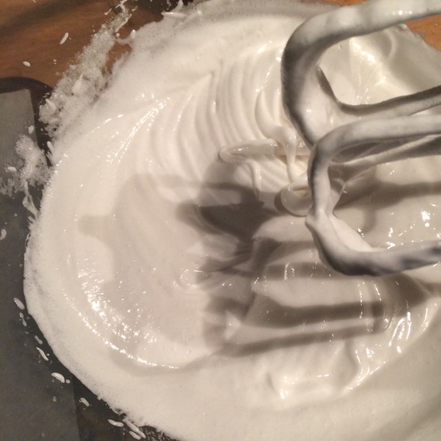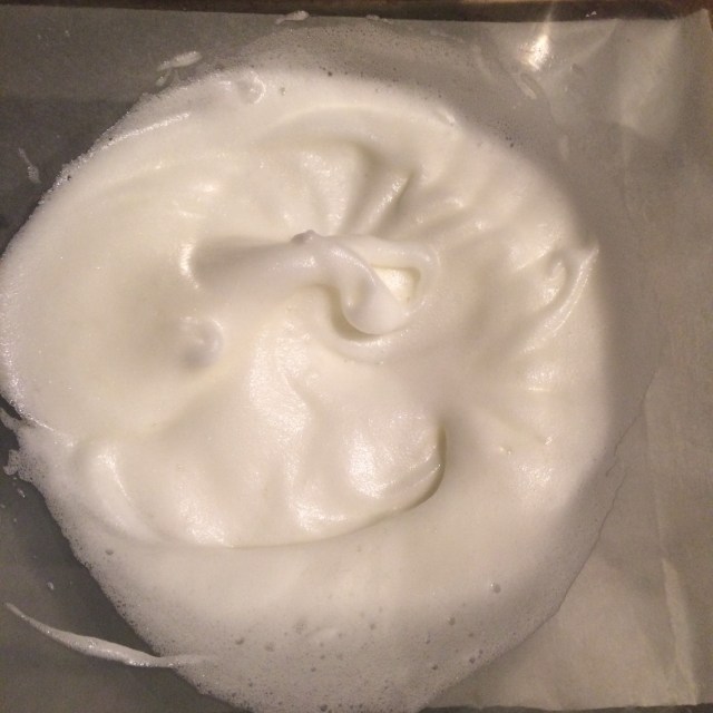 Then add 180g sugar (caster for preference but I use what I have) and beat it some more, the books always say stiff peaks but mine look like this (it’s a poor photo but you get the idea)