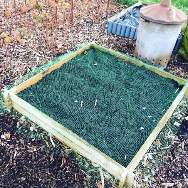 We filled the three beds and planted garlic and broad beans, covering all of them in the now traditional green netting to deter the foxes.