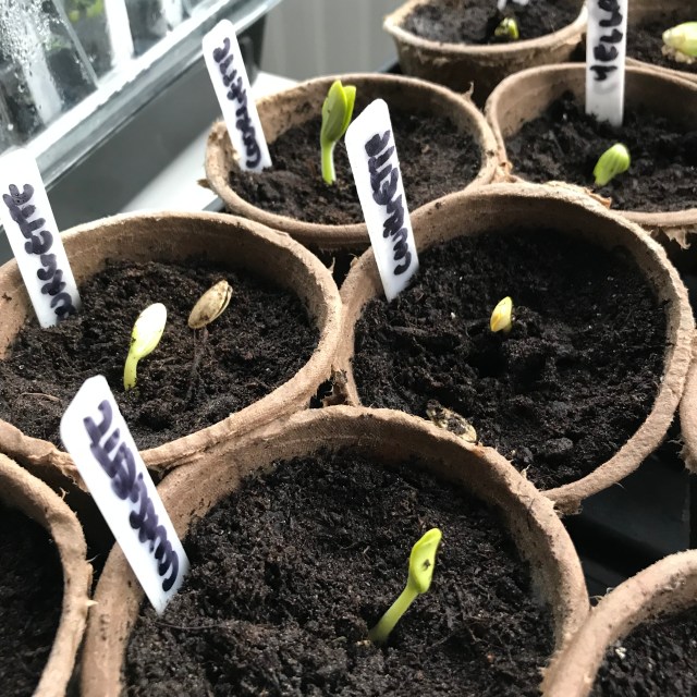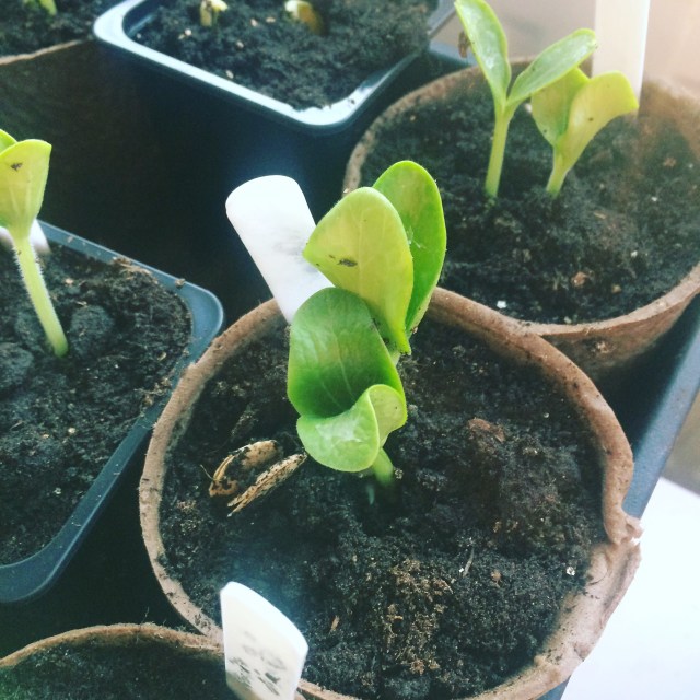 We will always grow the crookneck squash because it’s Ma’s favourite and one plant happily takes over a square bed. We also plan on 4 courgette plants, two green (last year’s striato d’italia), two yellow (atena polka). I sowed four crookneck seeds and eight courgettes.