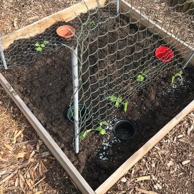 We also planted up the Uchiki Kuri, Butternut, Candy Roaster and Burgess Buttercup (in the three sisters bed). Then I noticed that one of the buttercups hadn’t make it and replaced with a spare uchiki kuri. Of course to get there, we had to dig up raspberries and fill the beds so it wasn’t as simple as it sounds.