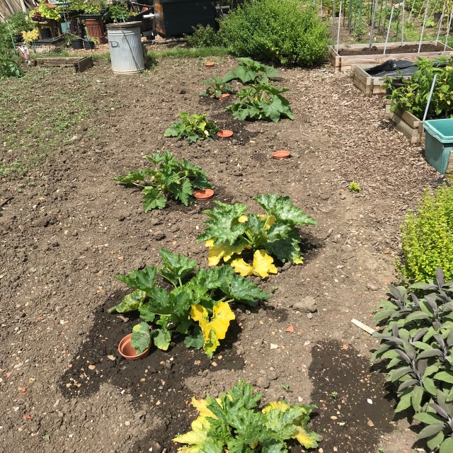 At the courgette end, we now have six courgette plants (three striped and three yellow) and two crookneck plants. They are all looking ok and about to start producing, the yellow courgette have worryingly yellow leaves but are otherwise ok.