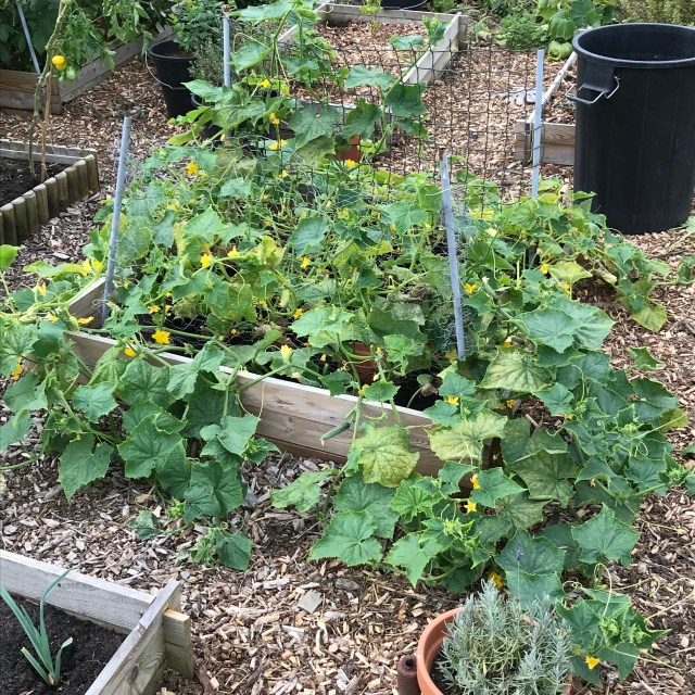 We finally have some high summer veg. Just as August ends! I was beyond excited for the tomatoes and corn but didn’t think we had any cukes until I was cutting back the leaves of the rampant cucumber bed and there were two. There will (weather willing) be a few more next week.