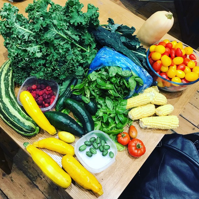 I didn’t take a photo of my shopping this week but from the allotment we’ve had cukes, tomatoes, kale, sweet corn and squash.