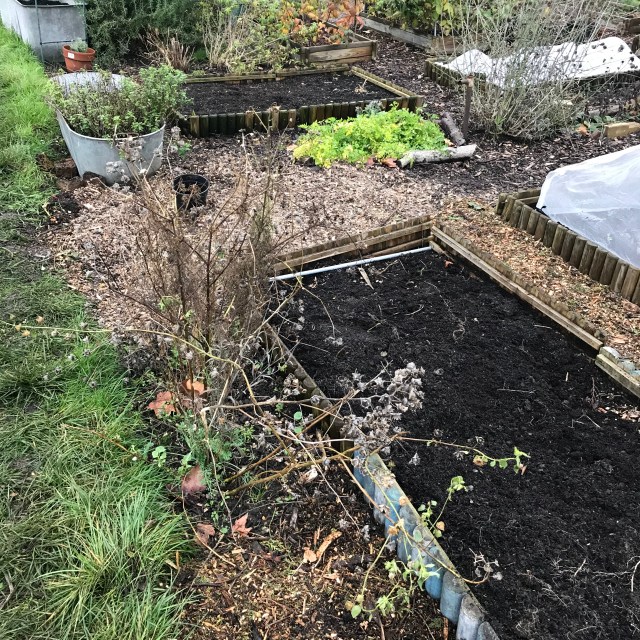 We have so much work to do to join the old and the new halves of the plot together but we have made inroads into the work. This weekend we moved the compost dalek on the old half to the compost area on the new half. So the compost area has two full bins and one half bin all layered with woodchip and a container, full of weeds that shouldn’t go into the compost and water. The weeds will decompose and then I’ll add it all to the compost. It’s pretty gross but it works. The only thing left to do is to buy and/or built two more bins that I can turn compost into, but that will wait until later.