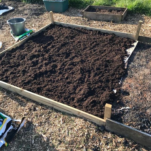 But I have been transporting compost to the allotment three bags at a time and filling up the beds. We bought 46, 50 litre bags of compost and it’s not quite enough. Yeah, I know 2,300 litres of compost, I’m aware but the new beds are completely empty, the old beds need filling and the soil on the new half is knackered. It’s stony, heavy clay and it’s been slightly neglected and needs some love in the form of compost! So things I thought might not need compost (rose garden, flower bed next to the herbs, pond area) are going to need a compost mulch at some point.