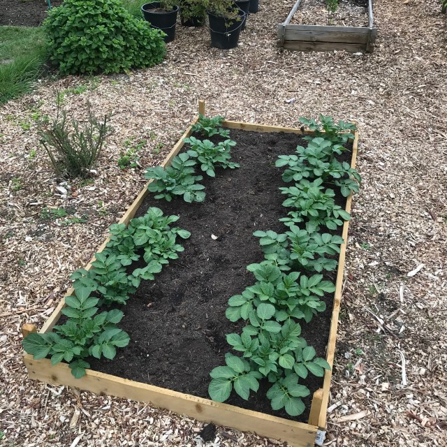 There are potatoes everywhere, in the bed I put them in but also rogue ones all over. I generally have a ‘if it’s useful or pretty don’t pull it up’ policy with weeds, which is why there are patches of rocket and coriander all over the paths, why there is aramanth, california poppies and borage everywhere and why we let the mystery squash grow last year. The only exception to this rule are raspberry runners but I’m a little stumped about whether to leave the potatoes or pull them up, for the moment, I’m so focused on the weeds I really don’t want (there is so much bindweed on the new half) that I’m leaving the potatoes alone but overall this is why I decided to grow them in pots..