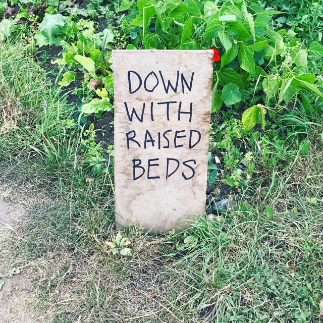 Perhaps you should all come up with creative paper plate signs of your own which you replace every often…. “make compost not war” “so many veg so little time” “Insanity is doing the same thing, over and over again, but expecting different results….like weeding”