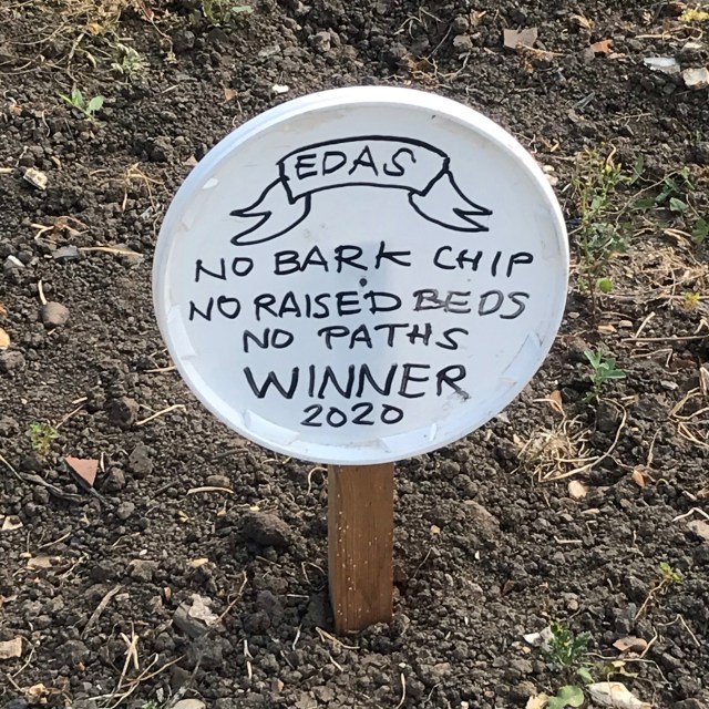 Now this year, I did not win an allotment prize but Dennis my amazing potato growing neighbour, who’s plot is opposite the plot with the sign, did, ‘Best Traditional Plot’. This chap did not, he doesn’t have paths, raised beds or woodchip. He also doesn’t have an award winning plot…