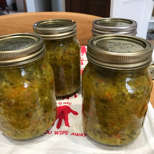 Then came a friend who has been thinking buying one and we’ve spoken about it and he decided that it would be a good birthday present and so now I have a pressure canner! So in the last couple of weeks, I’ve learned about canning beans, stock and tomatoes (because 25 minutes in a pressure canner even coming up to pressure is so much easier than hot water bath canning for 85 minutes!). I have about 7- litres of chicken stock, 18 jars of tomatoes and 4 jars each of chickpeas and black beans. This weekend, I also canned some dill pickle relish because we had 18 cucumbers from the plot! The cupboard of doom has been re-arranged to accommodate, this bounty.