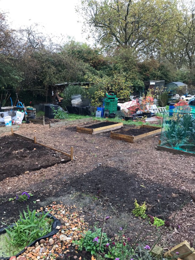 I’m still waiting for my compost bins to arrive and it was quite rainy on Saturday. So we finished building a bed and built another one.