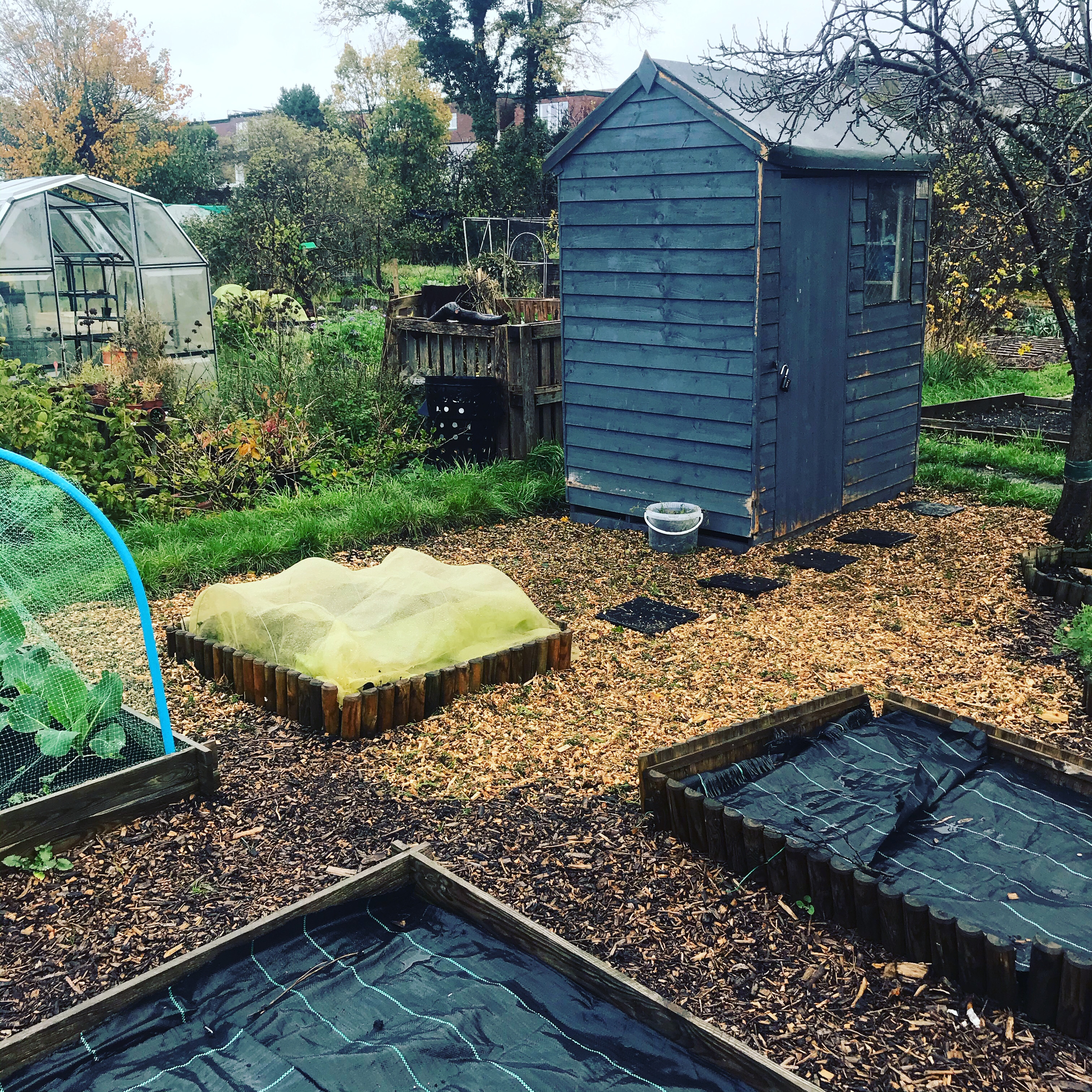 There was wood chip, so the next morning, Ma left early and I went to the plot to do a little light weeding and some re-upping of the paths, I was doing alright and then the heavens opened.