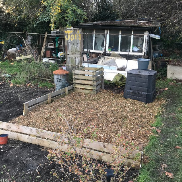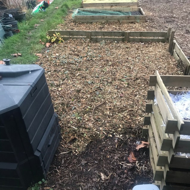 At the other end, we’ve made some decisions. The summer raspberries are gone (I’m sure they will make an attempt to come back in the spring but we’ll just keep pulling them up!) We currently have two blackcurrant bushes in one bed, so next week, I’ll move one of them to the bed where the summer raspberries were. If there is woodchip, I’ll top up all the fruit bushes with it as that’s always helped them.