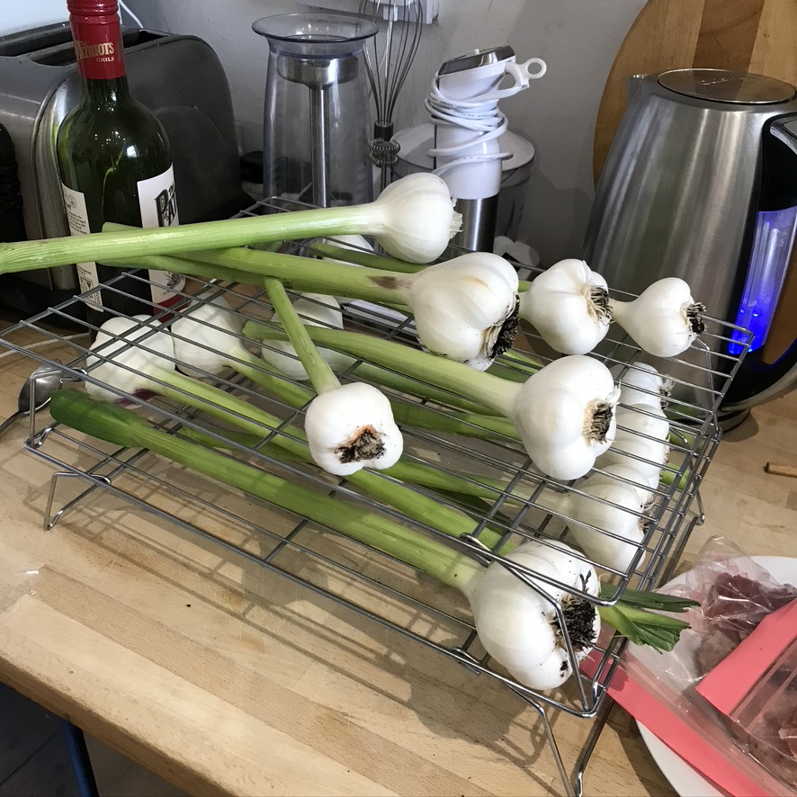 We did do a bit of harvesting too. I thinned some beetroot so Ma took some babies home and we got beetroot greens. There was rhubarb (another 1.5kgs) but the star was the garlic. This is the third time I’ve tried to grow garlic and honestly we’ve not had much luck. These bulbs came as part of an allium offer last autumn and they’ve done really well. I’m chuffed. I figure this will last us about a month (Ma is a garlic fiend!). I could have left it in the ground a bit longer but I want to get the garlic, onions and shallots up before I put in the leeks and get the garlic up before the rust got any worse.