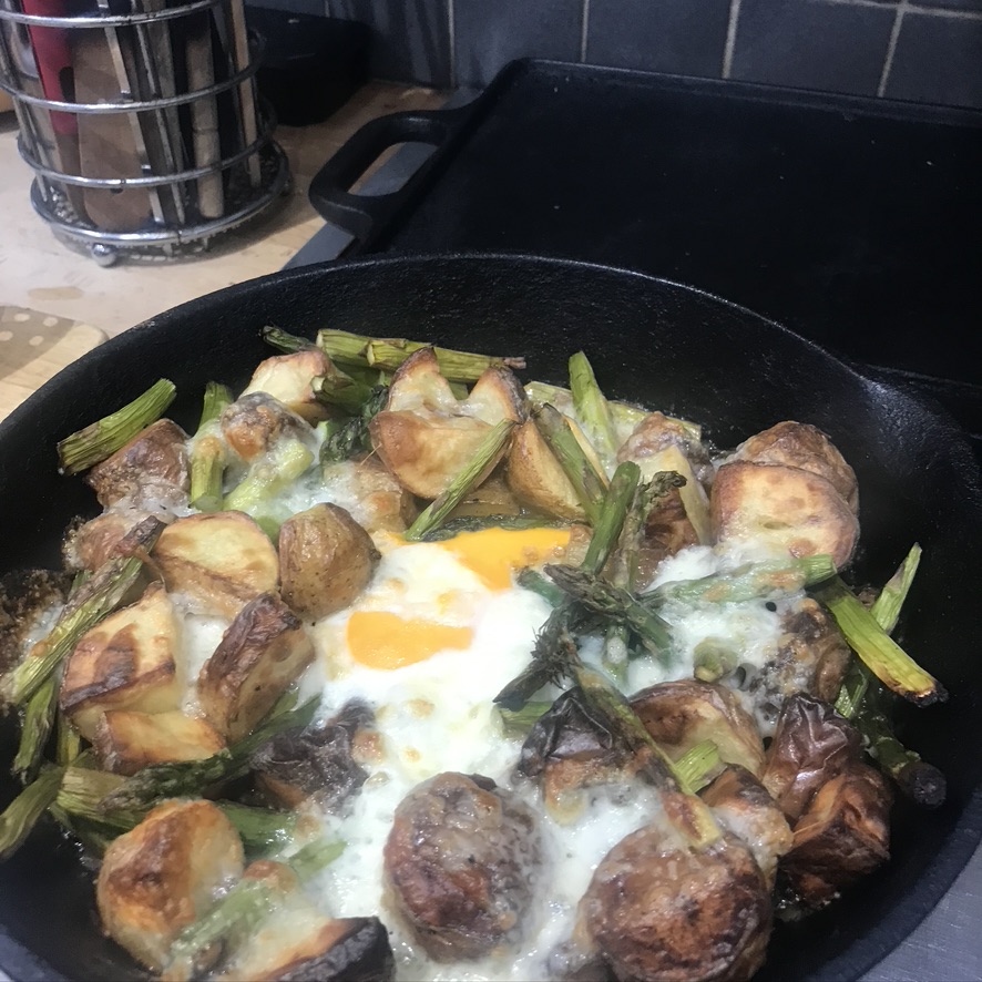 Take potatoes and chop them to a new potato-ish size. Chop up an onion or a couple of shallots and toss both of them in olive oil and stick in an overproof pan (I use my cast iron one) bake for about 20/25 minutes. Then add some chopped veg, asparagus works, so does broccoli, cauliflower and Romanesco. Add to the pan, toss and put it back in the oven for 10 to 15 minutes. Finally take it out of the oven again and make a well, crack an egg into the pan and back into the oven for about 3 to 5 minutes. If you don’t like or eat eggs, some mozzarella works well instead of the egg.
