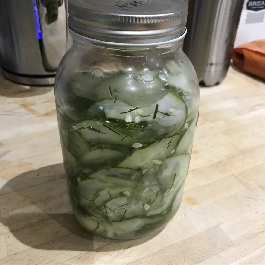I decided to make some pickles. These are Smitten Kitchen’s Easiest Fridge Dill Pickles. I didn’t have a big enough jar, this did two of my cucumbers. They’re good and I will be probably making another batch before the weekend.