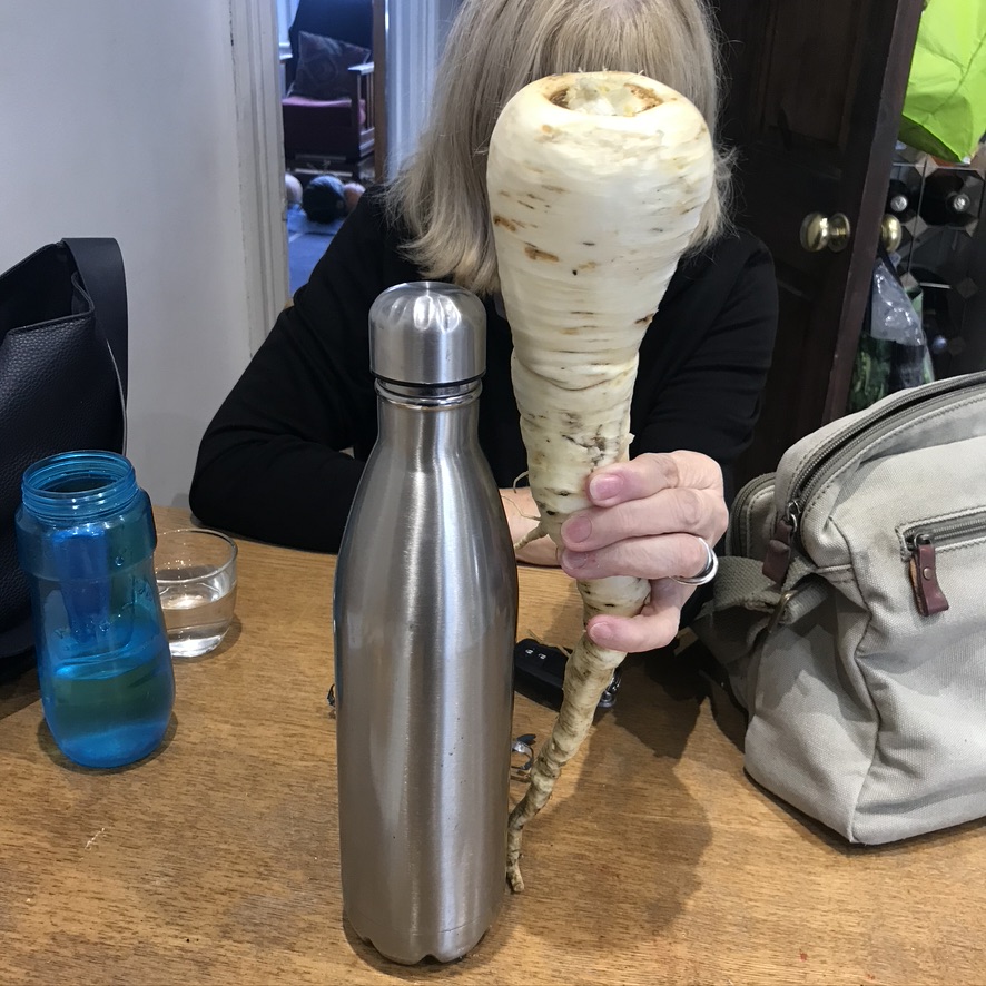 We collected the produce, which took ages, we had loads of raspberries (despite the bad year the plants seem to have had!), four ‘bonus’ winter squash, two cabbages, chard, kale, turnips, the most massive parsnip I have ever grown and some bonus short, fat ones, some salsify and herbs (lemon verbena, rosemary, lemon thyme and winter savoury.