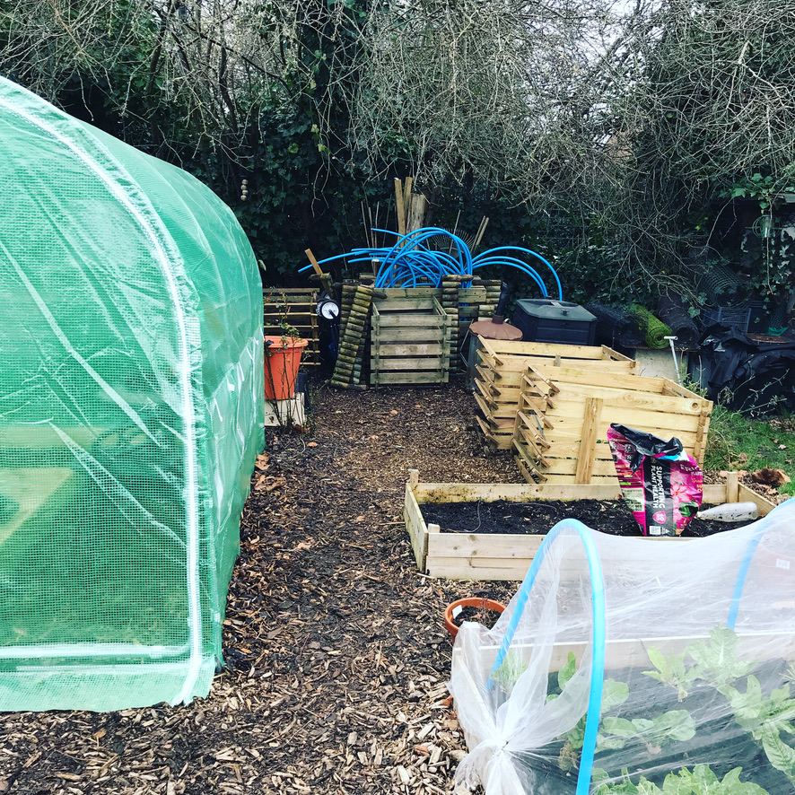 We swapped the position of some of the compost bins and storage, because something was digging up the middle compost bin and depositing it all over the path. It gives us a wider path by the polytunnel and so far no creatures digging it out.