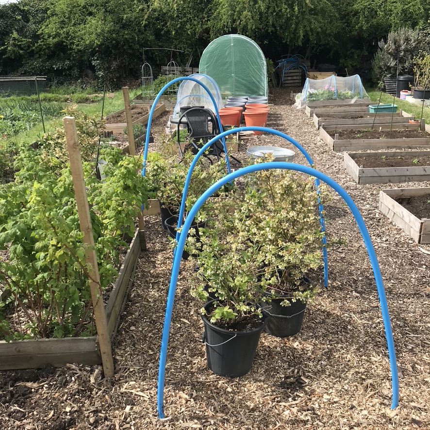 Then we set up some arches for netting the blueberries, it’ll be a bit of a squeeze (there are eight bushes!) but should all fit. If all the blossom turns into fruit, we are going to be drowning in berries.
