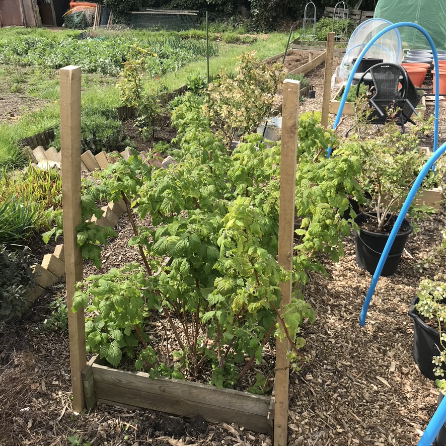 Then we sorted out the blueberries, but that meant adding posts to one of the raspberry beds. We have two beds, one I cut right down in January and one I just tidied a bit. That second bed is flowering already which was my plan, so we get a longer run of raspberries and hopefully not too much of a glut! However that means that we are going to need to contain the canes a bit and we’ve had this on the plan for both beds but I’m short on posts and wire, but we started with what we had and got three of the posts up. I’ll finish it when I’ve bought more posts and wire.