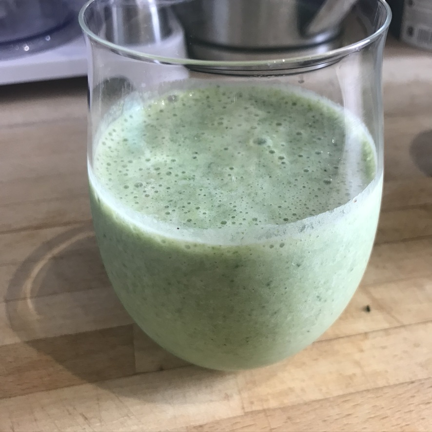I made up the smoothie packs with one kiwi, half an apple, half a banana, a handful of spinach. In the morning I add half a cup of whole yoghurt and half a cup of water and blend.