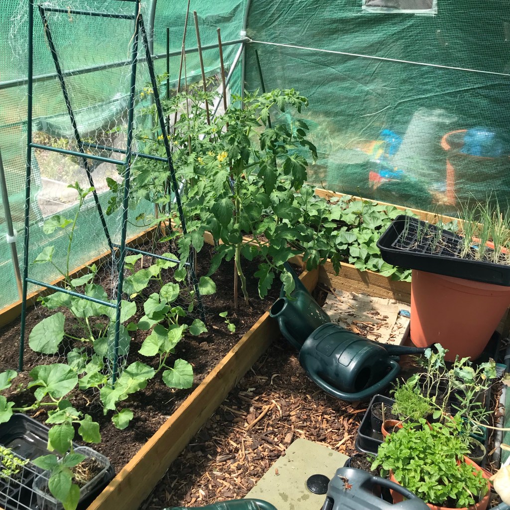 This weekend we’re going to buy some shelves for the polytunnel because I’ve got too many plants and plans to grow more! Not big plans but as I have somewhere to put plants that isn’t my house, I’m going to sow some things to replace things that come to an end, I’m thinking of it as autumn prep, although as yet, I’m not sure what to grow, probably pak choi, chard, turnips, radishes and winter salads (the usual winter selection!). I also want to have a go at sowing some flowers, like foxgloves and hollyhocks we’ll see if I actually manage that!