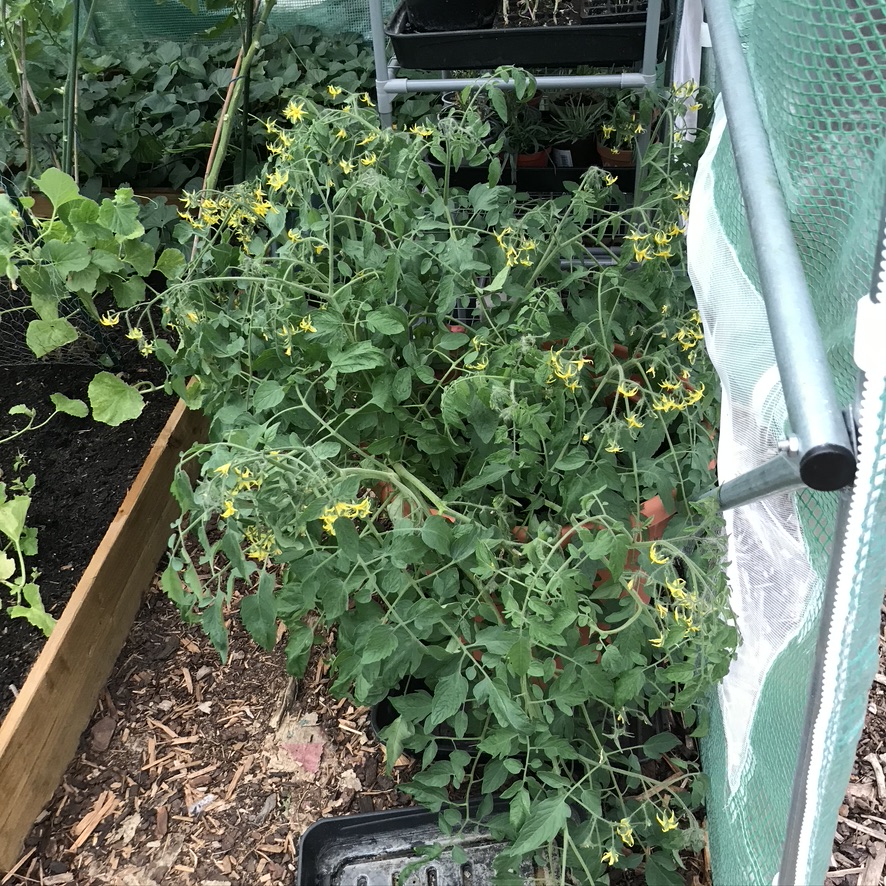 The polytunnel is bursting, if you cast your mind back to May when I panicked about the tomatoes and ordered 12 Sungold tomatoes via a Grown Your Own magazine offer and when they turned up, they weren’t Sungold and they were in a state and I took the last three and planted them up and put the container in the poly and hoped for the best? Only one of the three survived. Clearly ‘plant Sparta – they live or they die’ really worked for the one that lived because it’s trying to take over the poly. It’s not the only plant trying to do that, the sweet potatoes are wild. Last year we grew them outside and it was a really bad summer so we got some but not many reasonably sized potatoes, this year I did them in the poly and we had the kind of summer that they would have been fine in. The irony. If they’ve done well in the poly, I’ll probably do some inside and some outside and see what we get…