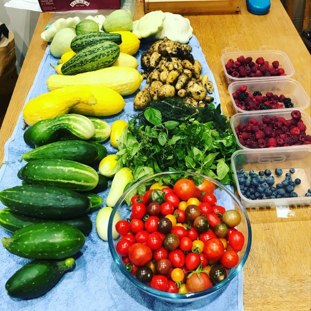 Last year, I did a lot of fruit compote, pesto, and froze other fruit but the vegetables we got through just eating. This year, we froze some rhubarb but didn’t can any, I made loads of cordial from the rhubarb and drank it. I’ve made blackcurrant jam, and apple butter and this weekend will get to Ma’s current favourite of plum and raspberry compote, there are blackberries and blueberries in the freezer with an unseemly amount of plums. This weekend, I’m also going to make more plum gin because I need some freezer space back.