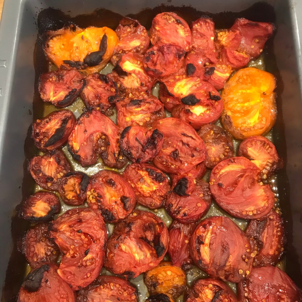 Tomatoes ripened off the plant don’t taste nearly as nice as tomatoes straight off the vine so roasting them is a great way to intensify the flavour they do have. Roasting everything together means less faff and less washing up which is always a good plan for me.