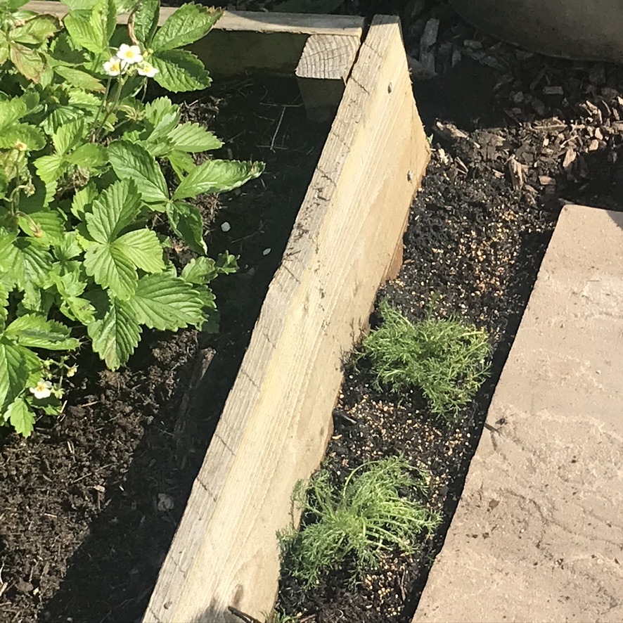 I planted some camomile lawn at the edge of the patio (something I’ve wanted to do for a while). I’d already put a roman camomile in the wild area and the other one, went in the corner of the alpine strawberry bed.