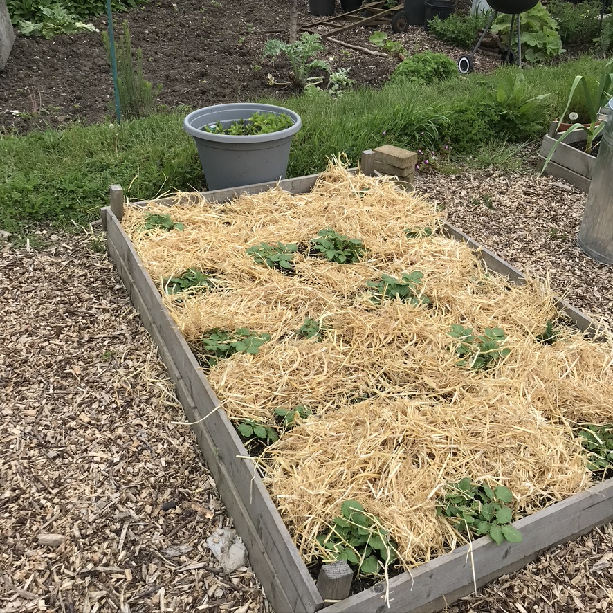 That done, we mulched the potato bed. I have only grown potatoes in a bed once before and it was really difficult to keep them watered. I’m also just not sure what the weather is going to do this year, this time last year, we were at the beginning of drought and I thought for this year, mulching would help with my growing. I may only use it on the potatoes, if it stays this wet, I might just experiment on a couple of beds and see if it makes a difference.
