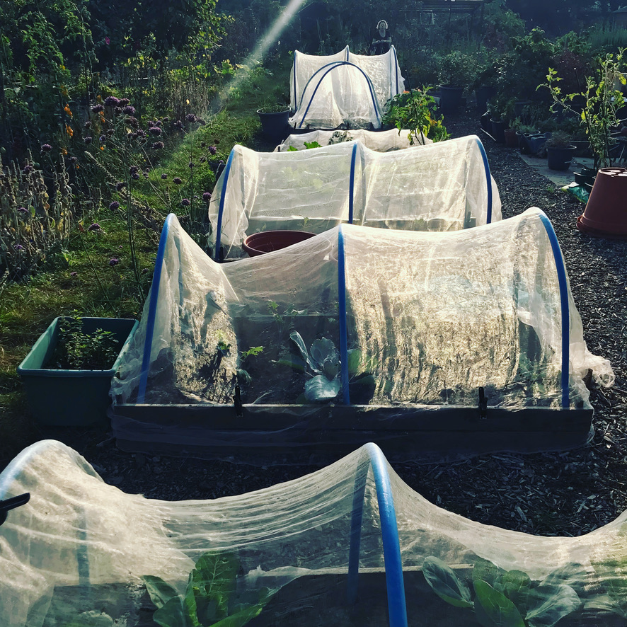 I pulled eight of them up and left the two best looking ones. I planted some of the red russian kale in the gaps and treated all the plants with diatomaceous earth (DE). I very rarely use DE, while it is organic, I know it’s not wildlife friendly. I only use it in extreme measures and on plants that are under mesh to prevent killing bees and other pollinators. But this level of infestation in September is extreme and I made a decision. I mention this because I have been told off about this before and all I am going to say about it is that I garden in an allotment in the city and we have a lot of pests, mostly I live with them. I accept that whitefly is something we have every year and I usually just live with it, it’s not generally a barrier to growing food and I wash all veg throughly, however, this whitefly has killed nine cabbages because it’s happened so early in the season and I have lots of plants that I’m intending to grow to feed me so I need to take measures…