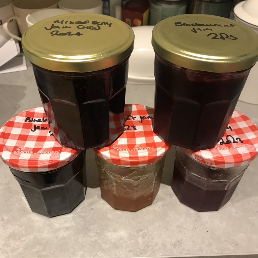 So my was to make several small batches so that we had lots of different flavours. which I did we’ve had apricot, blackcurrant, gooseberry, raspberry and blueberry. I’ve just finished this weekend with two batches, a mixed berry made up mostly of raspberries and blackberries from the plot and a mixed berry from frozen fruit. This because we seem to have run through it.
