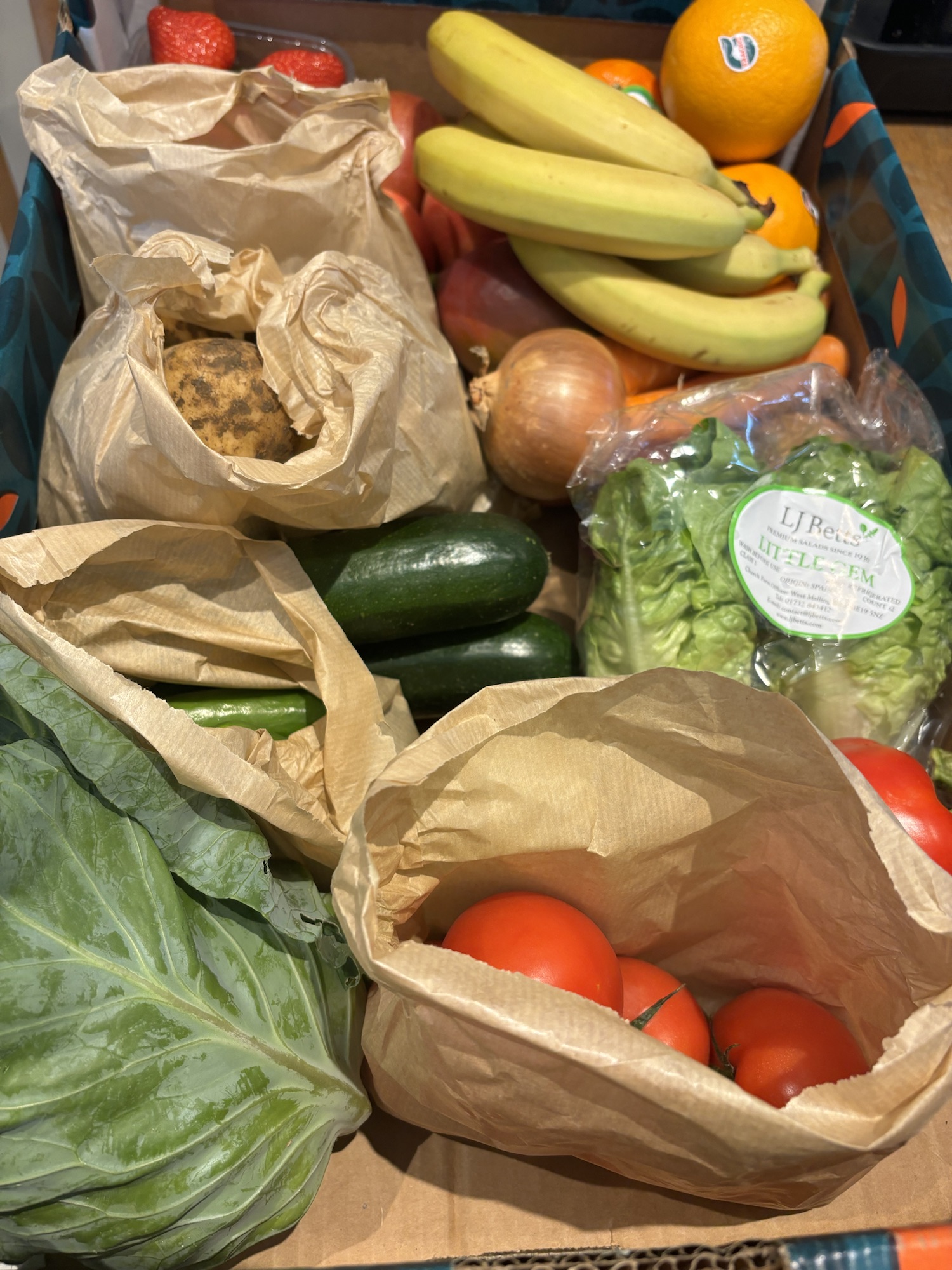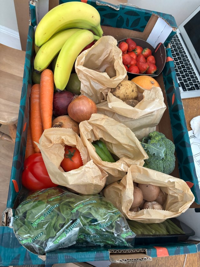 For £20 a box, James delivers (unless he’s in Australia!) on the day you specify via Instagram for me that’s usually a Friday. It’s a lovely box, you always get apples, bananas, oranges or satsumas or clementines, onions, carrots a cucumber, a pepper, lettuce, potatoes and tomatoes and then three other fruits and three other veg. Last Friday it was kiwis, grapefruit and strawberries for the fruit and mushrooms, French beans and broccoli. The quality of the veg is excellent, it is not always locally grown