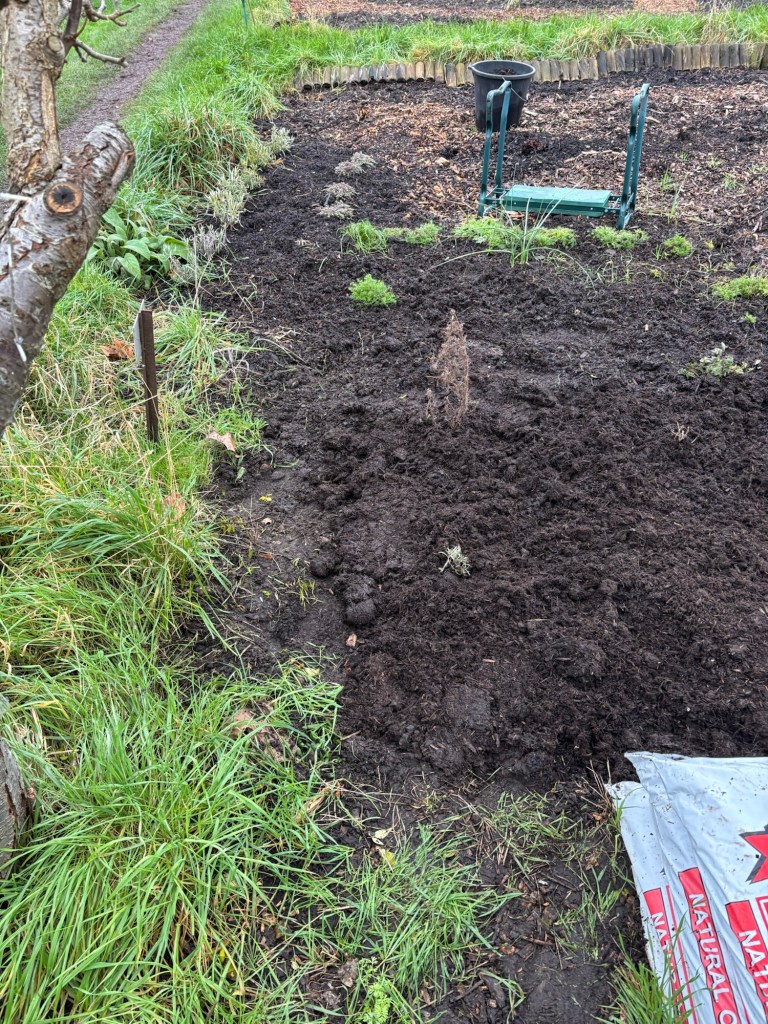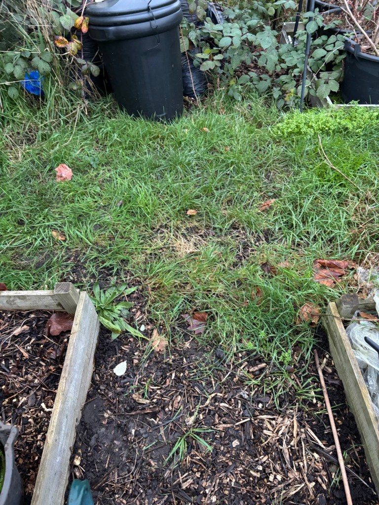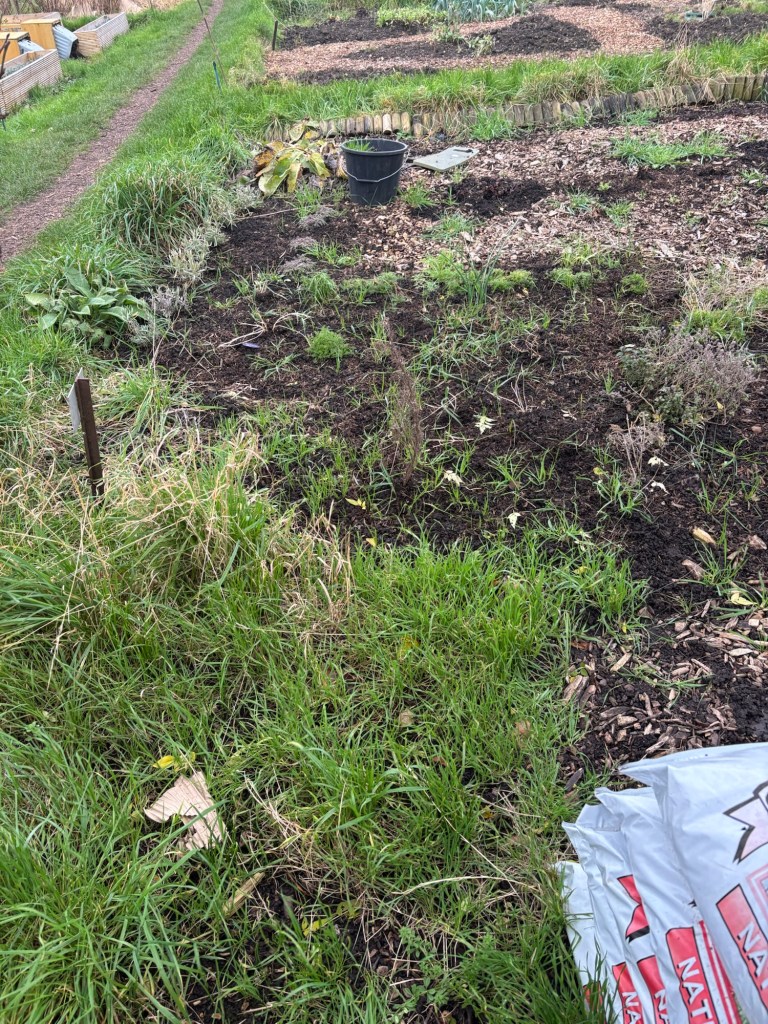 There is still loads to do but my plan is just to turn up every Sunday morning and do a couple of hours. Next week my mission is to cut down the other raspberry bed (and dig some canes up for plot neighbours), get the rest of the grass up under the plum tree, clear and top up three beds and start weeding around the gooseberry bushes.
