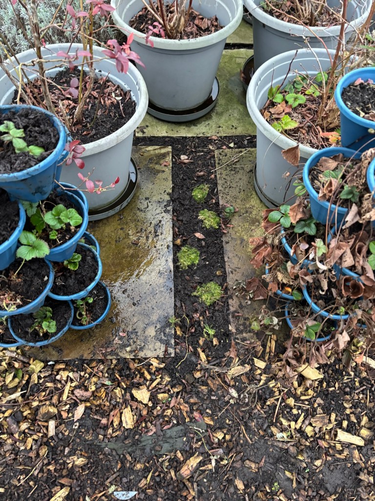 So the task for this weekend is more tidying up and potting up strawberries, I got the square beds cleared and weeded the paths around them. Sorted out another of the strawberry towers and planted some of the heath pearlwort in between the tiles