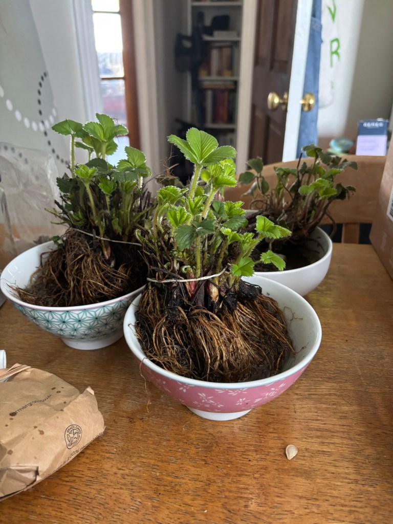 So the strawberries. Last year I planted asparagus plants, an initial 10 and then another which gave me about 15, that space is quite weedy and it’s going to produce anything I can eat for a couple of years and I read that strawberries are a good companion to asparagus and help to keep the weeds down. As I’m tidying up the strawberry towers, I’ve also noticed a couple of gaps. So I bought 20 bare root plants for the asparagus patch and six plants for the towers. Then my Kitchen Garden arrived and they had an offer of 20 plants for £7 and so I have lots of strawberry plants for this year.