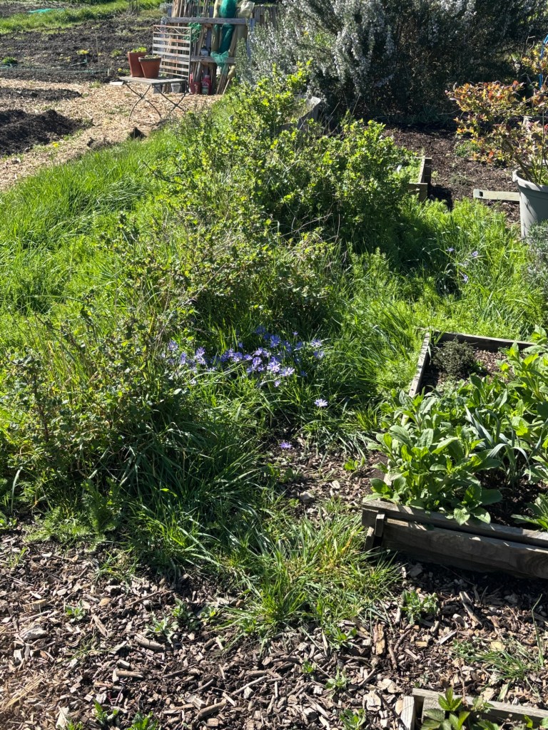 I started with watering! It’s really dry, so the strawberries, garlic, asparagus patch, blueberries and, blackcurrants got watered. I did a quick clear up of the front paths and really worked on the area around the gooseberry bushes. The idea is that there is a path from the front of the plot to the asparagus patch at the back not that you can see the path for the grass and the cornflowers!
