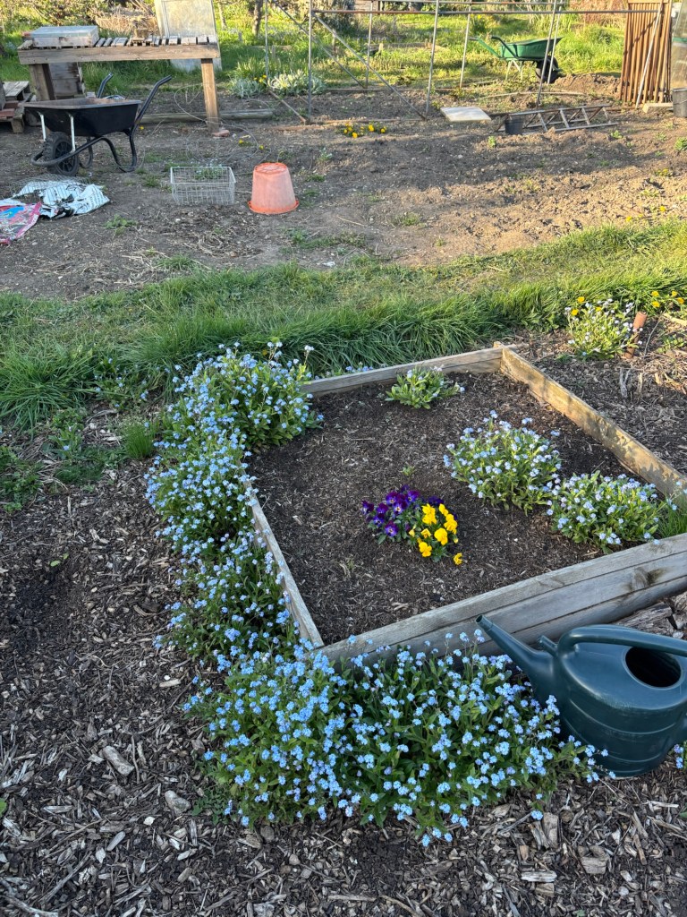 the forget me nots are pretty but outside of the bed is probably not where you want them to be!