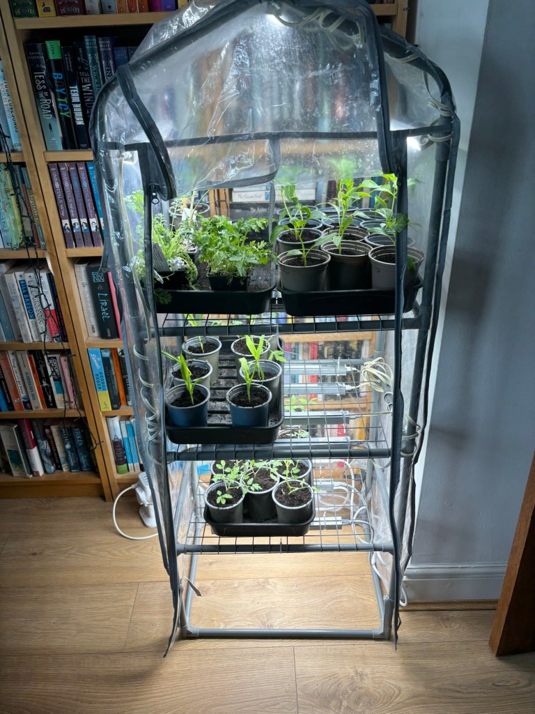 The indoor greenhouse is up and contains, cucumbers, tomatoes and sweet peppers and I’ll add to that this week with squash plants.