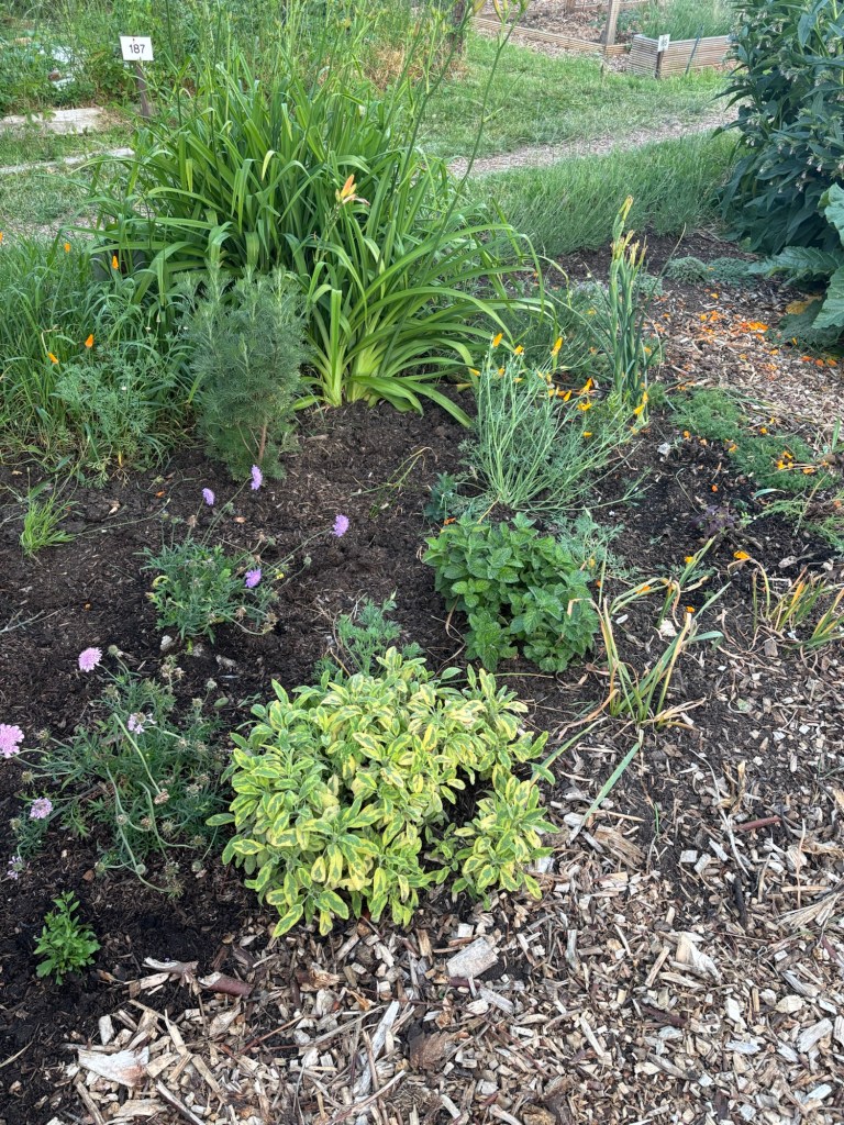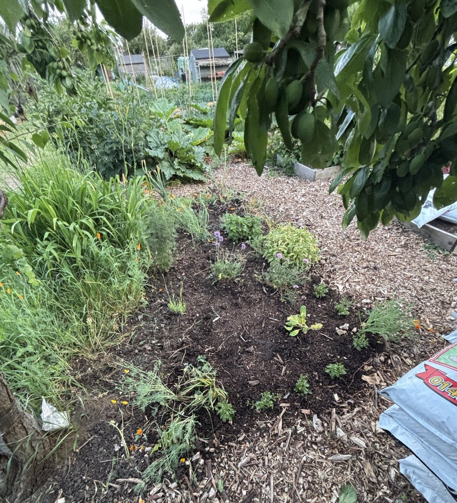 I weeded the front bed of the plot and planted the erigeron, the primrose and a sweet aztec plant in that bed. Planting in this bed is tricky, I want that bed to be full so I don’t see the soil because that’s better for it but I do have plants in there that will spread and I need some space to weed the grass which is not in anyway diminished because the plants are in that space. It’s just a space that needs regular attention to get rid of the grass and I’m confident that it will look amazing at some point in the future.