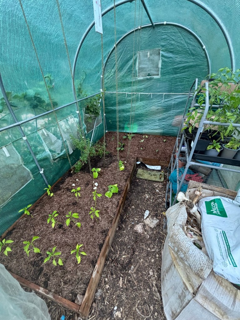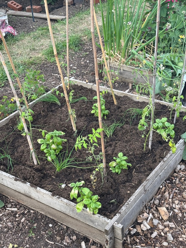 I planted up some of the tomatoes. This was a task, I put the tomatoes in. Watered, then I put chopped comfrey around them and added more compost to cover that, added basil and chives to the bed and watered again. At some point I’ll have some marigolds and I’ll add those too. The basil and chives came from the supermarket herb section and were left on the plant table for a week so are fine with the outdoors, I do grow herbs from seed but if you can’t or haven’t, these pots work really well, just divide them and plant.