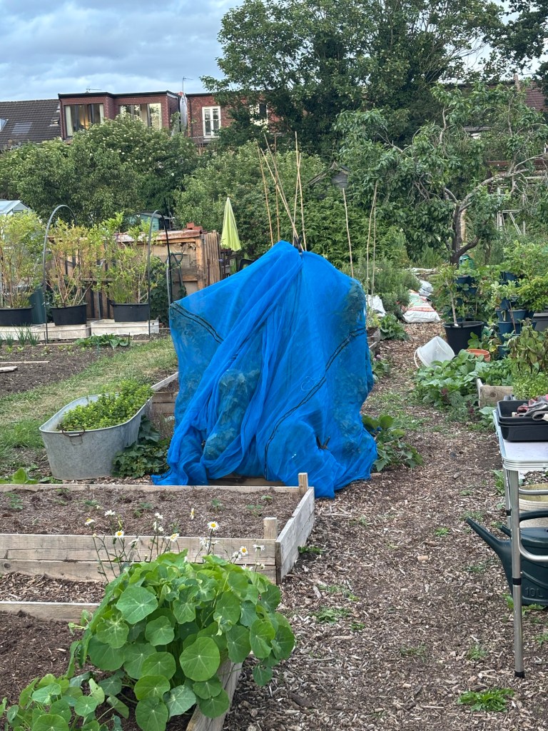 That was the planting part of the work done, so then I watered everything. Which took forever and finally, I netted the biggest of the blackcurrant bushes.