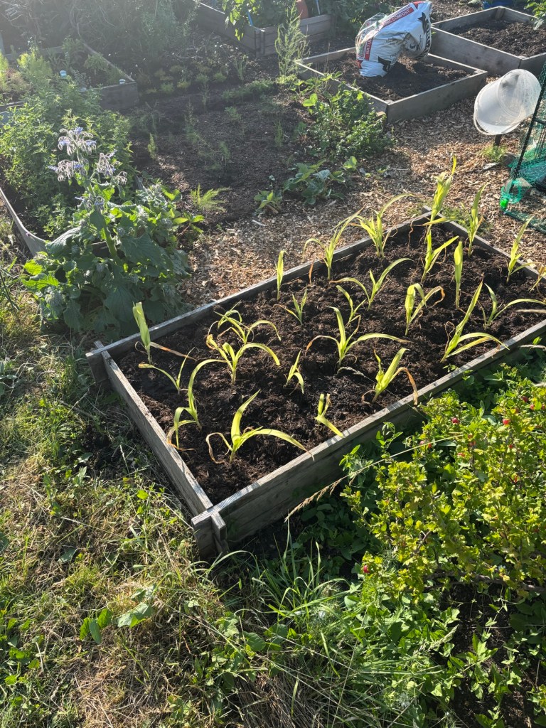 I have this idea that I’ll plant things next to the beds between them and the path. It’s never worked on the edge of this this bed. Chamomile, dead. Santolina, dead. Thyme, dead. You name it, it didn’t like it. What that does mean is that the soil isn’t terrible because I do keep topping it up every time, I try something new. I didn’t want to risk another dead plant, so I took a bunch of the flowering heads of the walking onion and planted them in that space (and in a corner of the actual bed) in the vain hope that I can break the curse and because I think they’ll be good there.