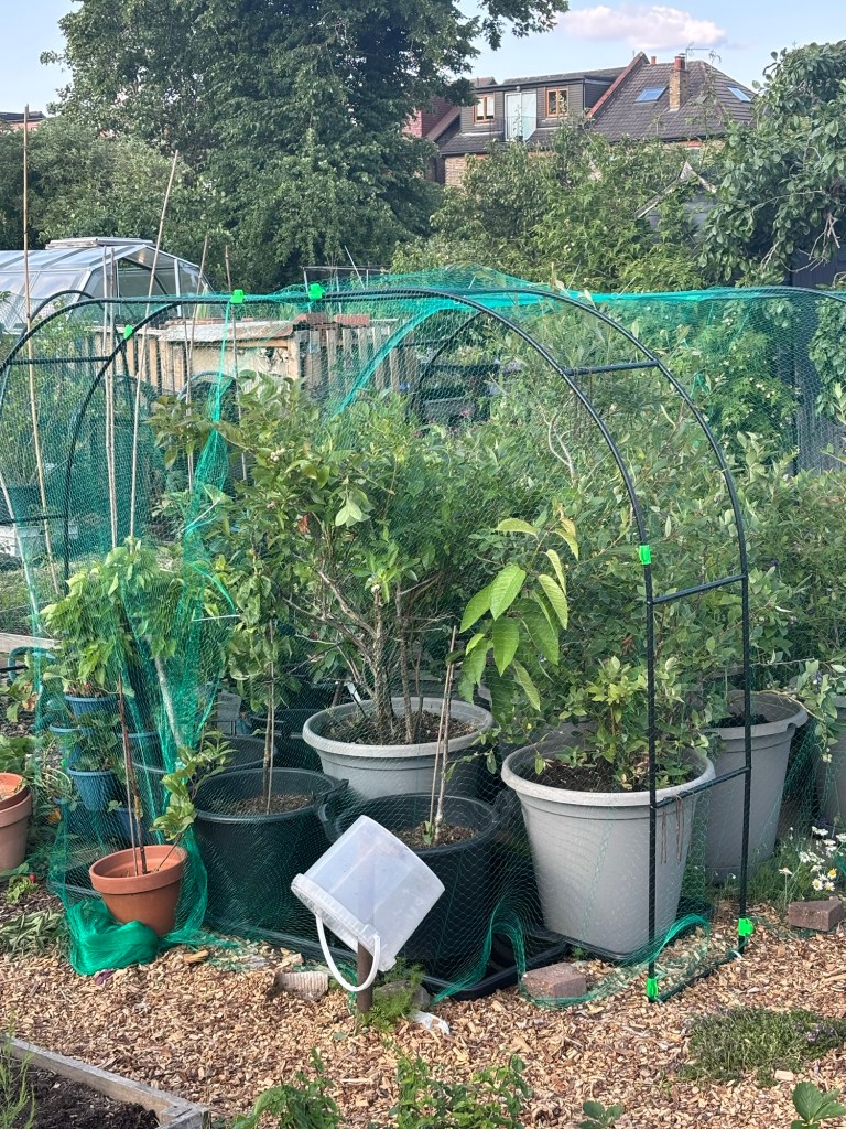 I really wanted to get the arches up and I needed to give one of the strawberry towers some attention. So I started with the strawberries which led to some weeding. And then getting the arches built and in place and, with some help from Sue and Richard, netted. It looks much better than I expected and I have a plan for better netting next year but this is a great £70 solution for now.