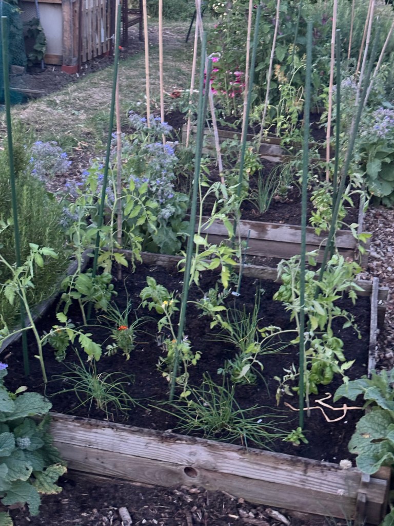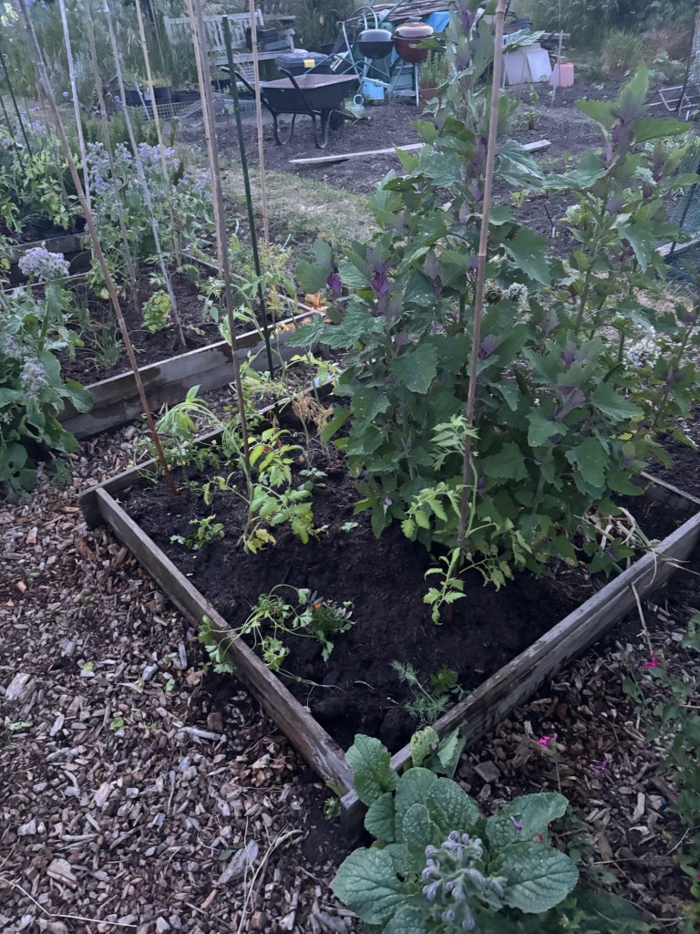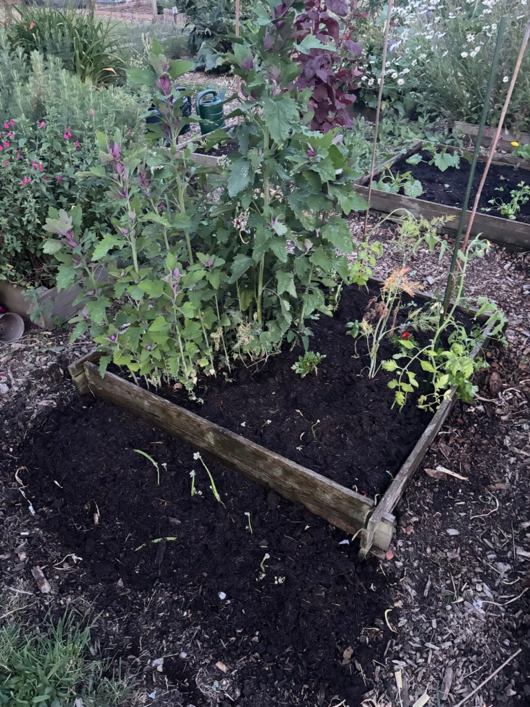 On Monday, I needed to go and water (I can’t remember it being this hot this early!) and got caught up in the ‘I’ll just do one thing’ trap. All the tomatoes in the polytunnel are now planted out! I’m working on, really filling the beds to see if that helps with weed pressure, so both of the tomato beds have basil, chives (bought from the herb section of Sainsburys and Waitrose and left on the plant table at the plot to acclimatise and then divided before being planted out) and marigolds interplanted. The last three tomatoes, went in the bed with the walking onions in them. This bed also had a volunteer tomato plant and a lot of tree spinach in it. The onions have been flowering like mad and have fallen over, so the bed needed some tidying up before I planted anything.
