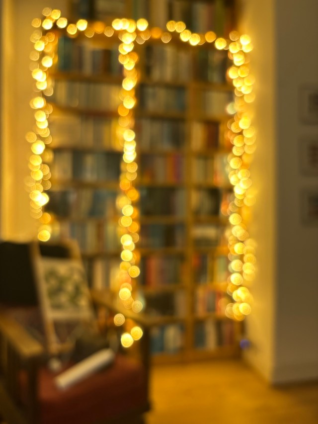 I’m trying to make home a pleasant place, and the other reason that Sundays are my day off are so I can clean and iron and generally make the house somewhere I want to be. One of the things I did last year after Christmas is hang some lights on the bookcase and as it gets darker I’m switching those on because they do cheer me up.