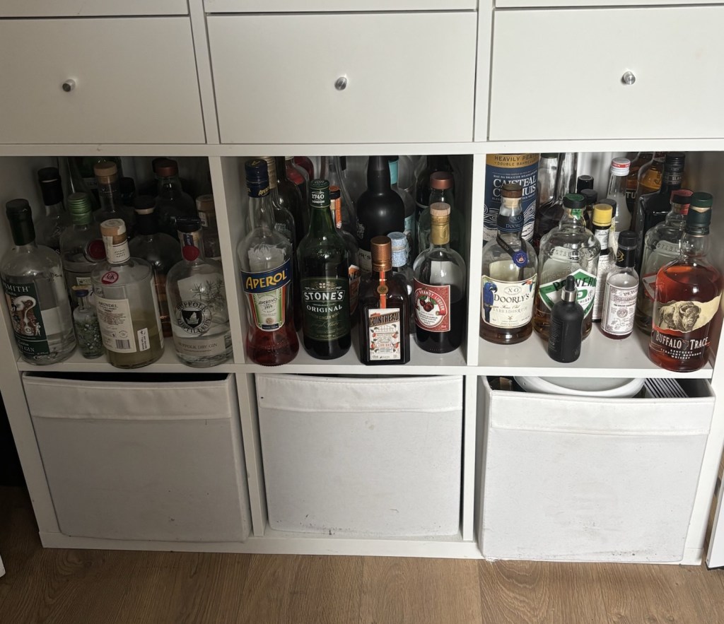 I’m fascinated by other peoples booze collections and mine lives in three sections of the kallax in the kitchen. I’m always surprised by how many bottles there are (although mine is pretty modest by the standards of my friends) and I can always think of sprits that I don’t have and should probably buy!