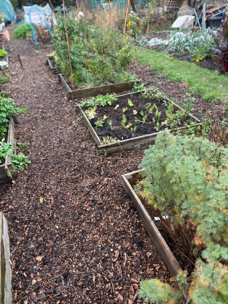 Then it was time for more woodchip. I’ve done up to the table but I still haven’t tackled the two side paths and the area in front of the table, I am close but it was raining by this point and I still had plants to situate