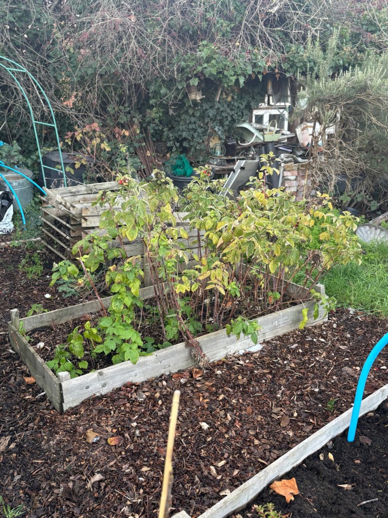 I wanted to cut back the raspberries and I did manage to do the back bed. I t started like this…