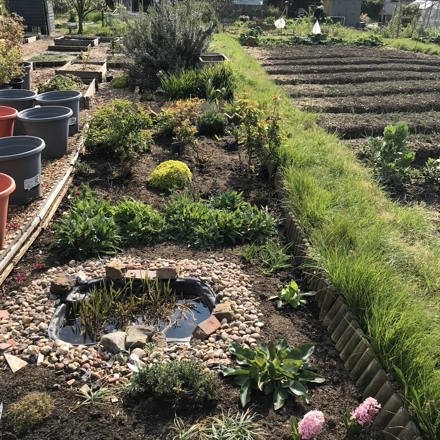 One of the areas of the plot I’m most proud of is the pond and rose garden. I’m ok at growing food but I’m not that great with flowers, although I’m trying to work on that to help the pollinators. This area of the plot, I made up all by myself, I moved rose bushes and plants and dug a pond and hoped for the best. And it’s not perfect but I think it’s looking pretty good.